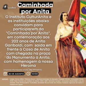 O Instituto CulturAnita, com apoio da Prefeitura de Laguna,da Banda União dos Artistas, de Escolas do município e entidades da Sociedade Civil, têm a honra de convidar toda população de Laguna para participar do evento comemorativo aos 202 anos de Anita Garibaldi em prol da preservação da memória de nossa heroina lagunense.